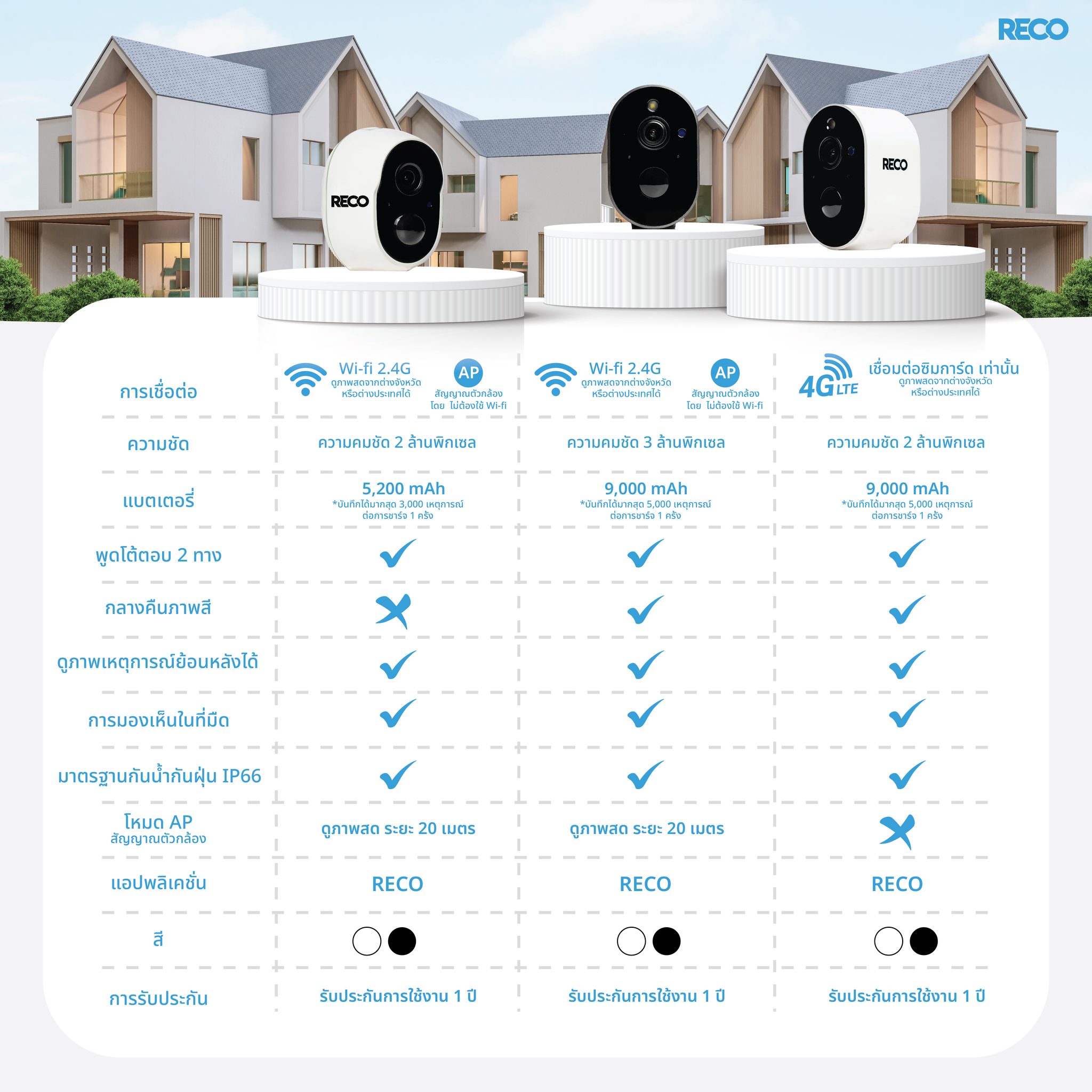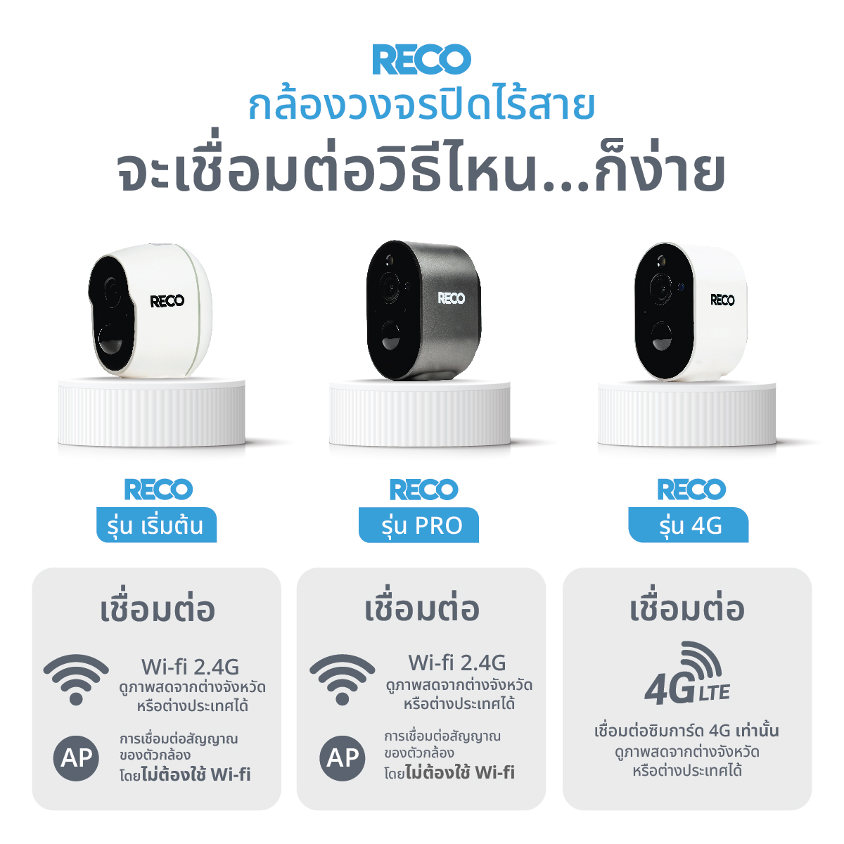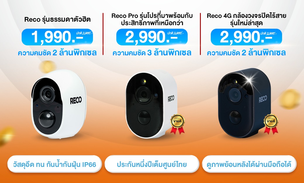 เปรียบเทียบกล้องวงจรปิดไร้สาย RECO ในแต่ละรุ่น ทั้งรุ่น Smart Wifi, 4G และ PRO